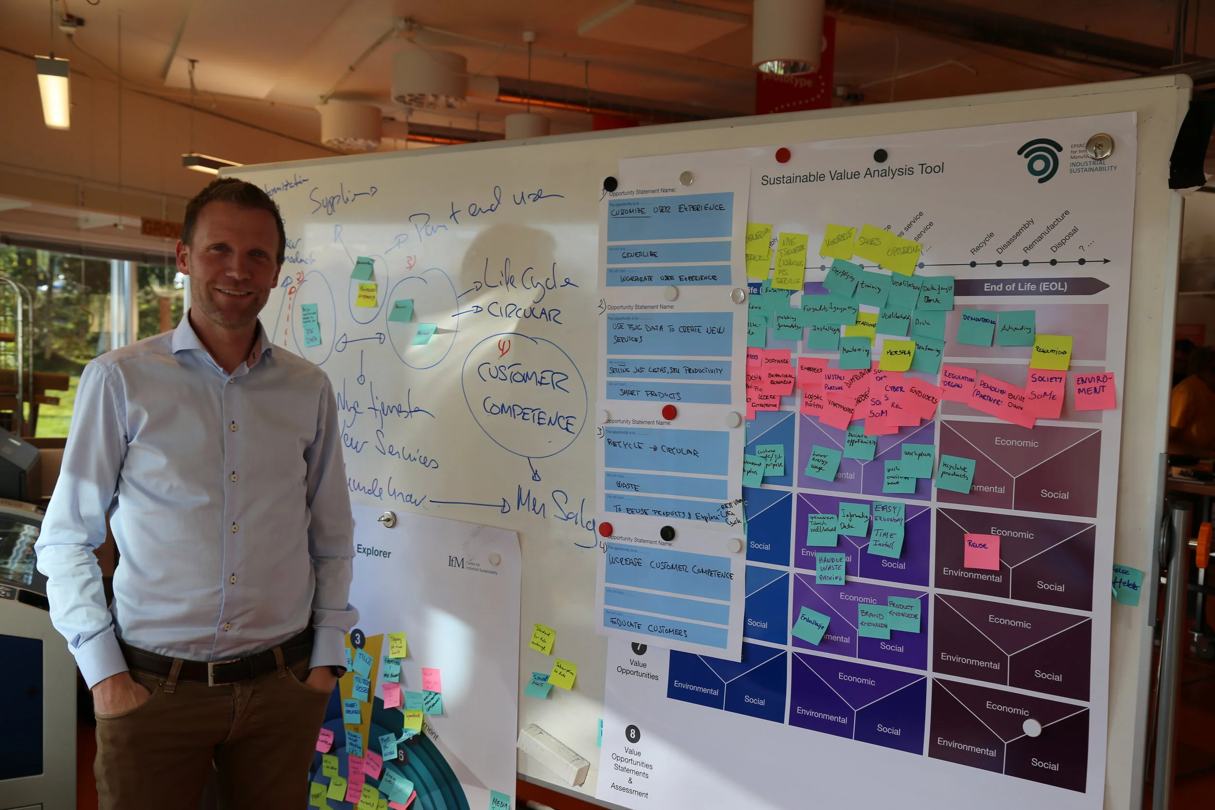 Styreleder i iKuben Birger Holo. Han er fabrikksjef i Glamox, og bildet er fra workshop i Innovasjonslaben med tema bærekraftige forretningsmodeller.