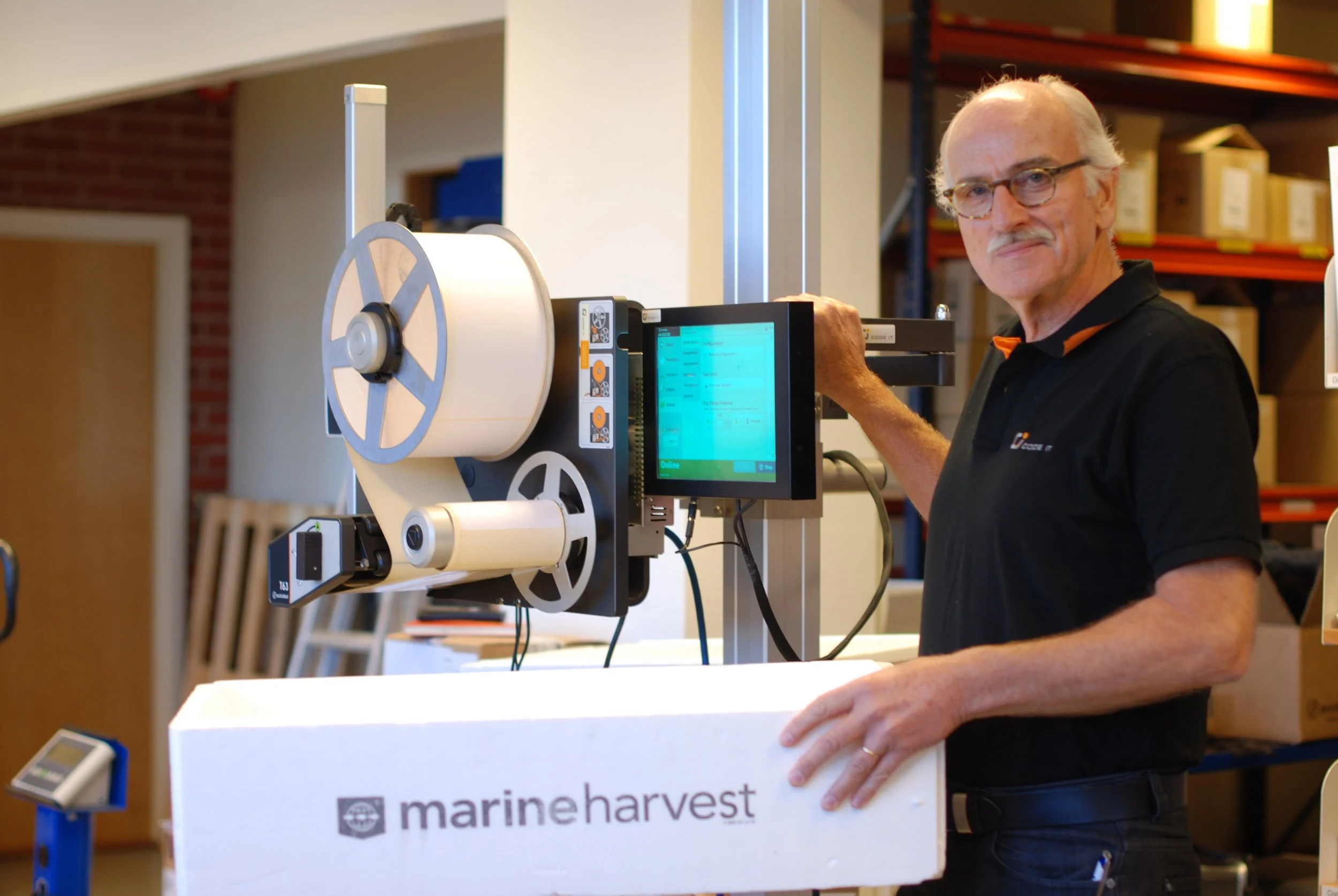 Torsnes viser etiketteringsmaskiner og styroporkasser til laks i CodeITs verksted i Østensjøveien. Kassene brukes av verdens største oppdrettsselskap, Marine Harvest. Som deres tekniske partner har CodeIT i dag installasjoner i Norge, Skottland, Irland, USA og Canada.